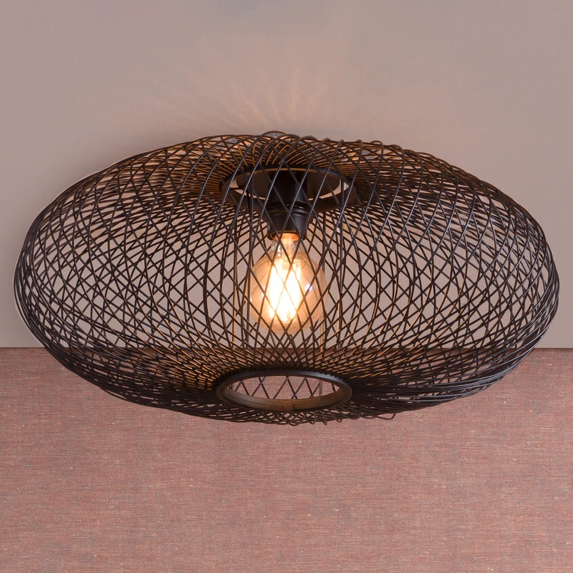 Aus zahlreichen feinen Streben bestehend, formt sich der natürliche Schirm der Deckenleuchte Cango, der vollständig aus Bambus hergestellt ist und eine elliptische Gestalt annimmt. Von Cango geht bereits im ausgeschalteten Zustand eine sehr natürliche Stimmung aus, die einen von Holz und natürlichen Materialien geprägten Wohnstil harmonisch ergänzt. Durch die vielen feinen Streben entstehen ebenso viele Zwischenräume, die in ihrer Gesamtheit ein ansprechendes Flechtmuster darstellen. Durch diese Zwischenräume und eine weitere, runde Öffnung am unteren Ende gelangt das Licht ungehindert in den Raum und zeichnet ein stimmungsvolles Lichtbild im Raum ab. Je nach Wahl des Leuchtmittels, welches durch die offene Gestaltung sichtbar ist, kann eine umfassende und angenehme Raumbeleuchtung erzielt werden.