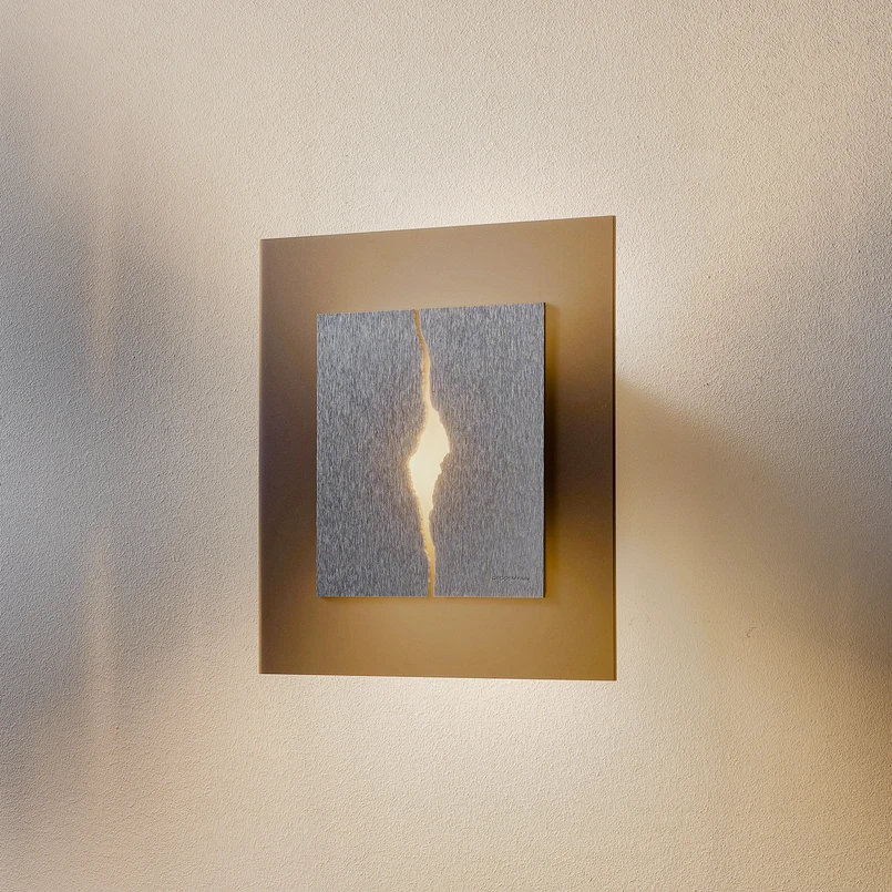 Der zentrale Abschnitt ist mit einem grob gebürsteten Aluminium belegt. Die Namensgebung spiegelt sich in einem Ausschnitt wider, in dem der matte Acryldiffusor zum Vorschein kommt und der wie eine Draufsicht einer Schlucht erscheint. Das Licht wird hier dezent direkt emittiert. Davon abgesehen wird es von der Rückseite reflektiert und erhellt die Wand in zwei seitlichen leuchtenden Bereichen. Dank der hervorragenden Farbwiedergabe lässt Canyon die umliegenden Accessoires in ihrer vollen Pracht erscheinen. Zudem kann die Wandleuchte über Phasendimmer geregelt werden.
