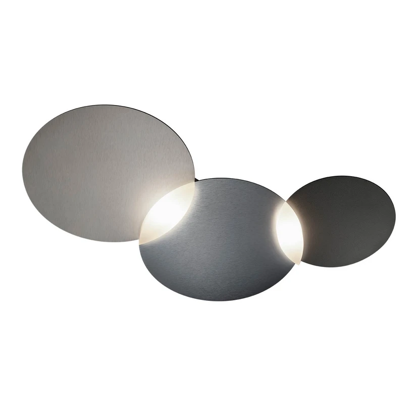 Die LED-Deckenleuchte Circ besteht aus drei kreisförmigen Elementen, die unterschiedlich groß sind und sich an zwei Stellen überlagern. Diese Schnittmengen tragen das Licht nach außen. Circ wurde aus hochwertigem Aluminium gefertigt und passt sich durch das abgerundete Design in unterschiedliche Wohnräume, wie dem Flurbereich, dem Wohn- oder Schlafzimmer ein.