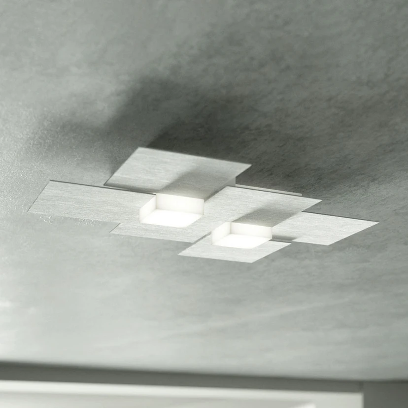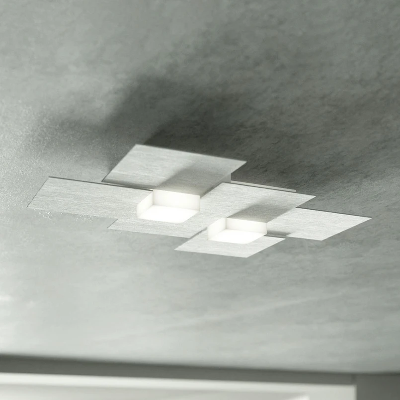 Das Design der LED-Deckenleuchte Creo ist geprägt von geometrischen Figuren: Sechs unterschiedlich gebürstete Aluminiumquader reihen sich aneinander und umkreisen zwei in der Mitte sitzende, würfelförmige Diffusoren. Diese beinhalten jeweils ein LED-Modul, das sein warmweißes Licht, das durch Dimmen immer wärmer wird, durch das milchige Acryl abgibt (exklusive Wanddimmer). Die Lichtoptik, die hierbei entsteht, ist besonders effektvoll: Je nach Blickrichtung changiert das Licht in unterschiedlichen Nuancen. Erzeugt wird dieser Effekt vornehmlich durch den Einsatz der unterschiedlich gebürsteten Quadrate - mal vertikal, mal horizontal.