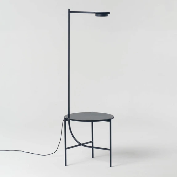 Die Basis des Aufbaus bildet eine mattschwarze Stahlkonstruktion aus einem dreibeinigen Tischgestell, einem schlanken, vertikalen Leuchtenständer und einem waagrechten, drehbar befestigten Arm, der den Kopf aus Aluminium hält. Letzterer kann zudem um 180° rotiert werden. Das warmweiße Licht der integrierten LEDs, das durch einen PMMA-Diffusor abgegeben wird, lässt sich ringsum ausrichten, sodass eine direkte oder eine indirekte Beleuchtung über Wand oder Decke möglich ist.