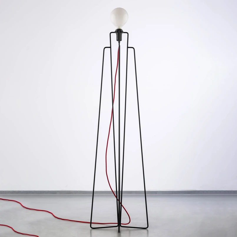 Pure Eleganz verkörpert die Stehleuchte Model M1, für deren Entwurf und Fertigung das kroatische Unternehmen GRUPA verantwortlich zeichnet. Charakteristische Merkmale der Serie sind der als überdimensionale Glühbirne gestaltete Schirm und das handgefertigte Gestell aus schlanken Stahlstreben. Letzteres setzt sich bei der Ausführung M1 aus acht Armen zusammen, die an der Basis zentral gebündelt sind sowie nach außen hin einen Kreuzfuß bilden. Das Gestell trägt einen kleinen zylindrischen Kopf, in den von unten das Steckerkabel eingeführt wird. Oben ist eine E27-Fassung vorhanden, in die der mitgelieferte Adapter eingeschraubt wird. Dieser ist mit einem E14-Innengewinde für die ebenfalls beiliegende, warmweiß strahlende LED-Lampe versehen. Mittels Gewindering wird der opale Glasschirm befestigt, der im Betrieb als gleichmäßig leuchtende Sphäre erstrahlt.