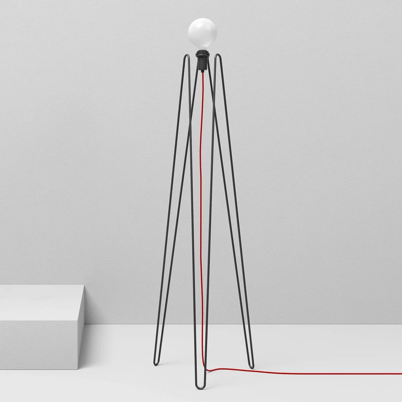 Organisch, futuristisch und äußerst elegant wirkt die LED-Stehleuchte Model M2 des kroatischen Herstellers GRUPA mit ihrem filigranen, handgefertigten Stahlgestell. Bei der Version M2 wird eine einzige Strebe verwendet, die oben und unten mehrfach gebogen ist, sodass sich insgesamt sechs Abschnitte ergeben. An drei Punkten berühren diese den Boden und dienen hier als Standfüße. Neben dem besonderen Gestell wird die Serie Model von ihrem Opalglas-Schirm in der Gestalt einer überdimensionalen Glühbirne geprägt. Der kleine Kopf verfügt unten über eine Einführung für das Kabel, über ein Außengewinde für den Befestigungsring des Schirms und über eine innen liegende E27-Fassung. In Letztere wird der beiliegende Adapter eingeschraubt, der innen die ebenfalls mitgelieferte E14 LED-Lampe aufnimmt. Diese macht mit ihrem warmweißen Licht den Glasschirm zu einer rundum strahlenden Sphäre.