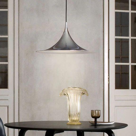 Das Design der Hängeleuchte Semi wurde von den dänischen Designern Claus Bonderup und Torsten Thorup kreiert. Sie schufen damit einen Lichtspender, der sich durch seine klassische Form sowie eine sehr atmosphärische Lichtwirkung auszeichnet, durch die sich Semi optimal für die allgemeine Raumausleuchtung und insbesondere zur Verwendung über einem Tisch empfiehlt. Das stimmige Design in konkaver, nach oben zulaufender Form lässt sich mit vielen Einrichtungsvarianten in Einklang bringen.