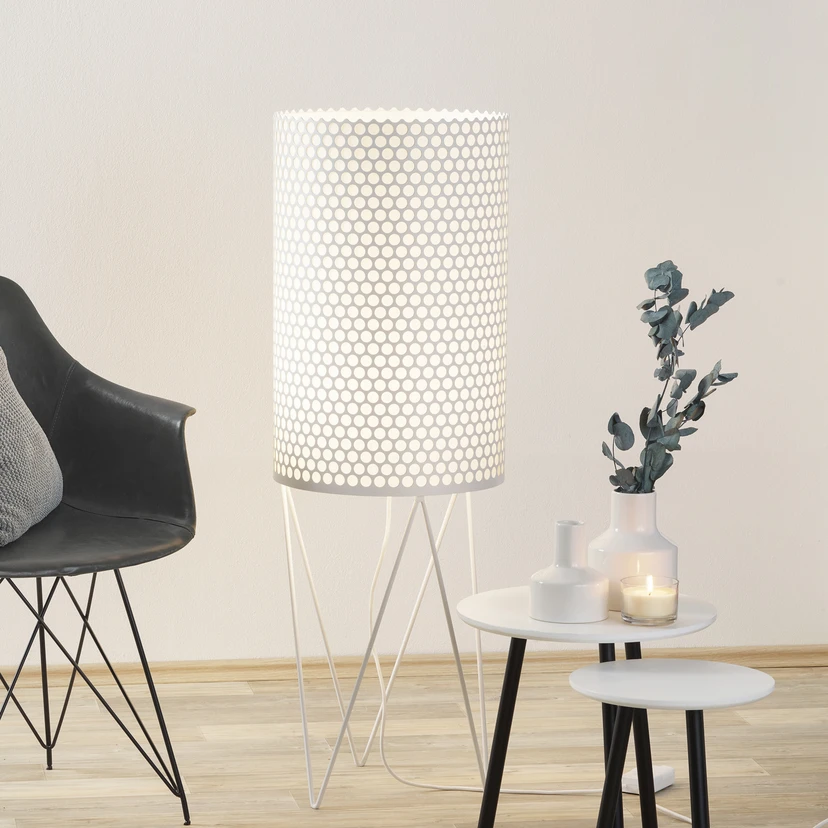 Die Stehleuchte Pedrera fügt sich in die unterschiedlichsten Wohngestaltungen ein. Das Licht der eingesetzten Lampe wird vertikal sowie sanft durch die winzigen punktförmigen Lichtauslässe im Metallschirm ausgestrahlt.