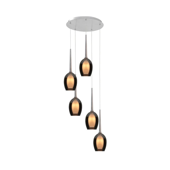 Entdecken Sie die Hängelampe Belle, die mit ihrem rauchgrauen Glas und den nickelnen Akzenten eine moderne Eleganz in jedes Wohnzimmer, Esszimmer oder Schlafzimmer bringt. Die 5-flammige Konstruktion sorgt für eine gleichmäßige Lichtverteilung, die den Raum in eine angenehme Atmosphäre taucht. Obwohl ein Dimmer nicht im Lieferumfang enthalten ist, lässt sich die Helligkeit durch einen externen Dimmer individuell anpassen, um die gewünschte Stimmung zu erzeugen. Mit der Hängelampe Belle wird Licht zum faszinierenden Gestaltungselement Ihres Interieurs.