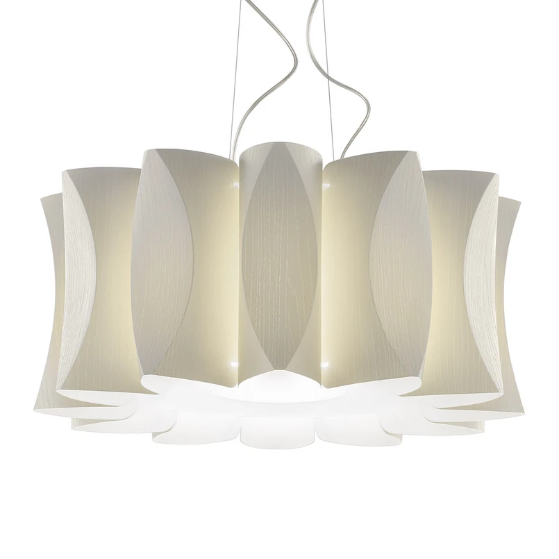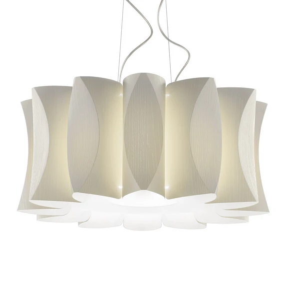 Ein absoluter Hingucker ist die Hängelampe Maxi Virus bereits ausgeschaltet. Ihr Schirm begeistert mit einer extravaganten und doch gleichmäßigen Form. Er ist aus Polycarbonat gearbeitet und mit einem feinen Holzdekor versehen. Sobald die Beleuchtung eingeschaltet wird, wird das Licht nicht nur nach oben und nach unten abgegeben, sondern schimmert auch sanft an den Seiten durch.