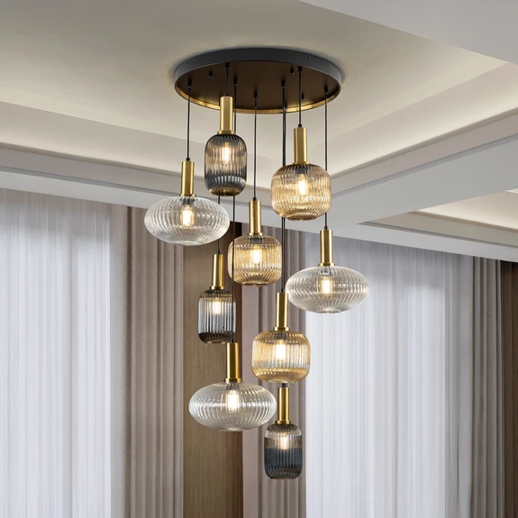 Die neunflammige Hängelampe Norma vereint stilvolles Design mit funktionaler Beleuchtung und wird so zum Highlight in jedem Ess- oder Wohnzimmer. Gefertigt aus hochwertigem Glas und Metall, beeindruckt sie durch ihre elegante Farbkombination aus ambe- und rauchgrau getönten sowie klaren Schirmen, messingfarbenen Metallröhren oberhalb der Schirme und einem schwarzen Baldachin. Die neunflammige Konstruktion sorgt für eine gleichmäßige Ausleuchtung, während die standardisierte E27-Fassung den einfachen Austausch der LED-Lichtquelle ermöglicht. Die Leuchte wird mit dimmbaren LED-Lampen geliefert. Mit einer Farbtemperatur von warmweiß (2.700 K) schafft die Lampe eine behagliche Atmosphäre.