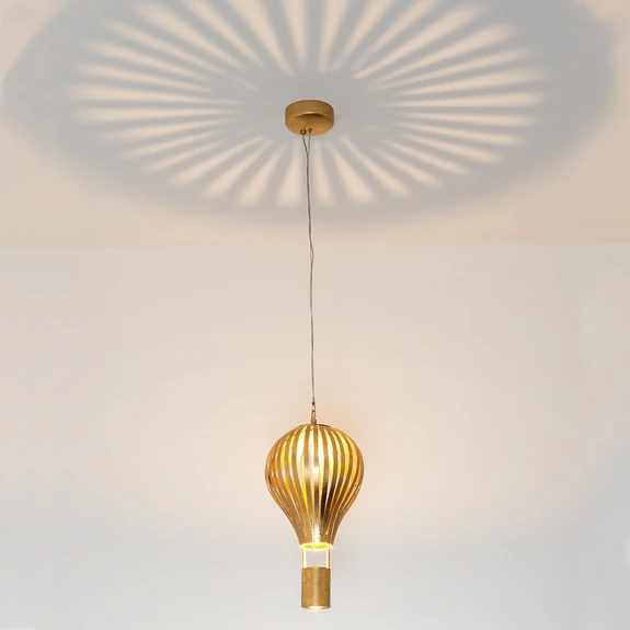 Die Hängelampe besitzt zwei Lichtquellen. Sowohl innerhalb des Ballons, als auch im Korb befindet sich jeweils eine LED. Aufgrund des goldenen Metalls wird dieses so reflektiert, dass ein besonders schöner Glanzeffekt entsteht.