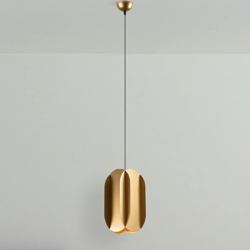 Die Hängeleuchte Corner vereint modernes Design mit hochwertiger Verarbeitung und wird zum Blickfang in jedem Raum. Ihr länglicher Schirm wurde aus vier ovalen Metallplatten zusammengesetzt. Die goldene Innenseite sorgt für noch mehr Behaglichkeit des abstrahlenden Lichts. Dank der modernen und doch zeitlosen Ästhetik passt die Hängeleuchte Corner in viele Einrichtungsstile in Esszimmer, Wohnzimmer oder Küche, wo sie einzeln oder zu mehreren Leuchten angebracht Tische und Theken erhellt. Die Leuchte ist in Europa gefertigt und steht für Qualität und Langlebigkeit.