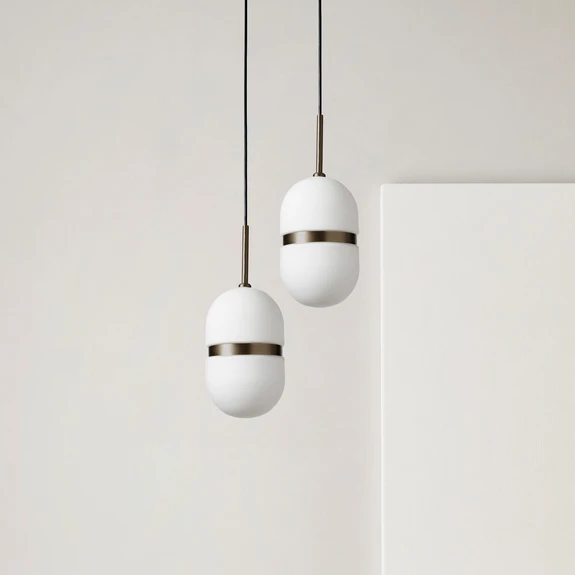 Ovale Hängeleuchte Domu mit weißem Glas und Halterung aus Bronze