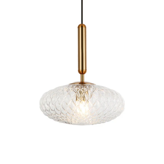 Diese Hängeleuchte wirkt durch ihren Schirm aus Glas leicht und elegant. Die Rillen, die auf dem Schirm ein interessantes Muster bilden, sorgen für einen faszinierenden Lichtaustritt. Mit bewussten Details wird die Exklusivität der Leuchte unterstrichen. Ein stabförmiger Körper kurz vor dem Schirm in ansprechendem Gold sorgt dafür, dass die Leuchte direkt ins Auge fällt. Diese Form harmoniert mit dem ebenso goldenen, runden Deckenbaldachin, aus dem eine feine Halterung in schwarzem Ton hervorgeht. Der Schirm ist in bauchiger, ovaler Form gehalten und umschließt das einzusetzende Leuchtmittel komplett. Dieses lässt den Lichtstrahl nach allen Seiten austreten und erzeugt eine stimmungsvolle Atmosphäre.