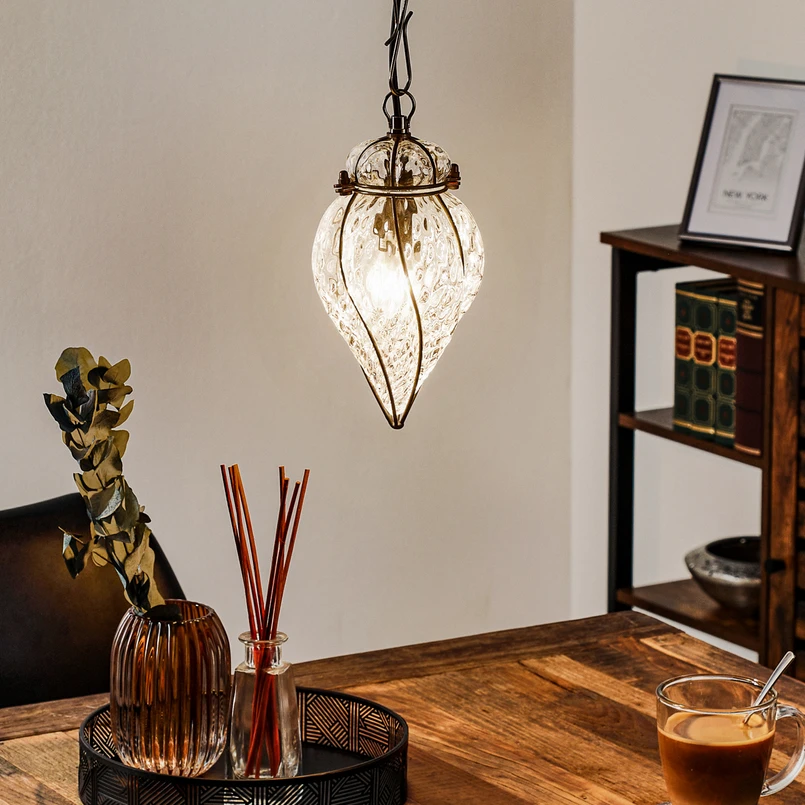 Ähnlich einer geschwungenen Phiole mit gefrorener Oberfläche hängt das Gebilde innerhalb einer Gitterstruktur herunter. In drei Größen ist diese glamouröse Beleuchtung gestaltet. Das italienische Glas ist mundgeblasen und die Leuchte in Handarbeit gefertigt. Hierdurch entsteht die einmalige, unregelmäßige Oberflächenstruktur. Der Glaskörper ist von einem verdrehten Metallgitter umgeben, welches bis hin zu der Spitze eine Glaswölbung umgibt. Darüber ist die Leuchte an einer Kette befestigt. Die Beleuchtung erfolgt sehr direkt und in einer angenehmen Intensität. Die Hängeleuchte wirkt innerhalb von Wohnkonzepten dezent und kann doch auch zum kleinen Kunstobjekt avancieren.