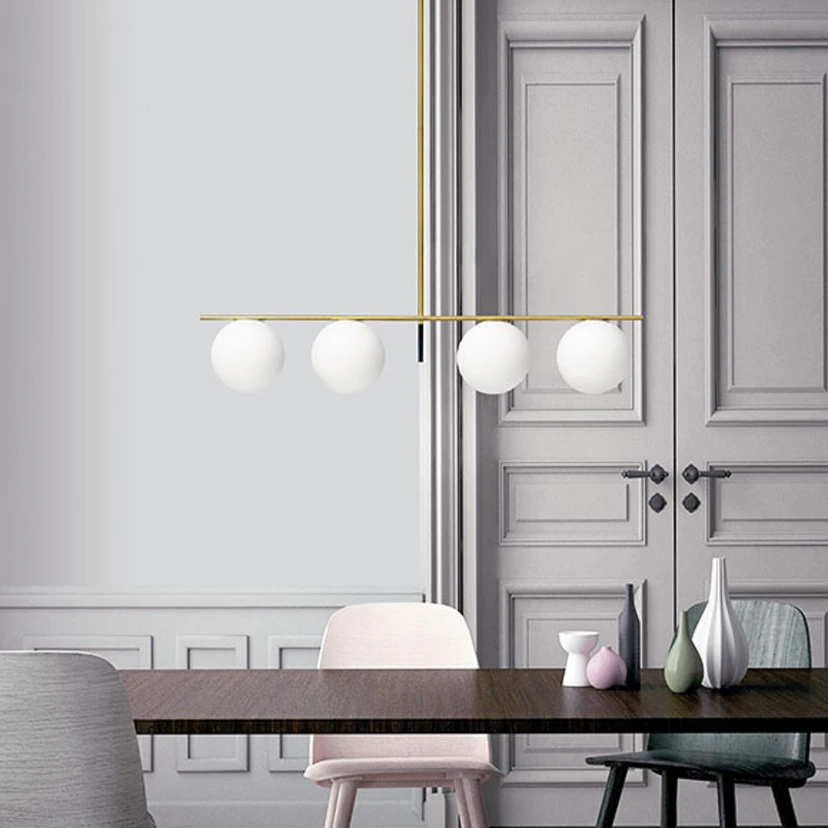 Die mehrflammige Hängeleuchte Jugen besteht aus einem langen Metallrohr, das mit einem Baldachin an der Decke befestigt ist. Etwas oberhalb des unteren Endes der Stange ist eine weitere Metallstange horizontal angebracht und dient als Träger für die Lampenschirme. Diese kugelförmigen Lampenschirme bestehen aus geblasenem Milchglas und verbergen jeweils eine E27-Fassung, die auch mit LED-Leuchtmitteln bestückt werden kann.