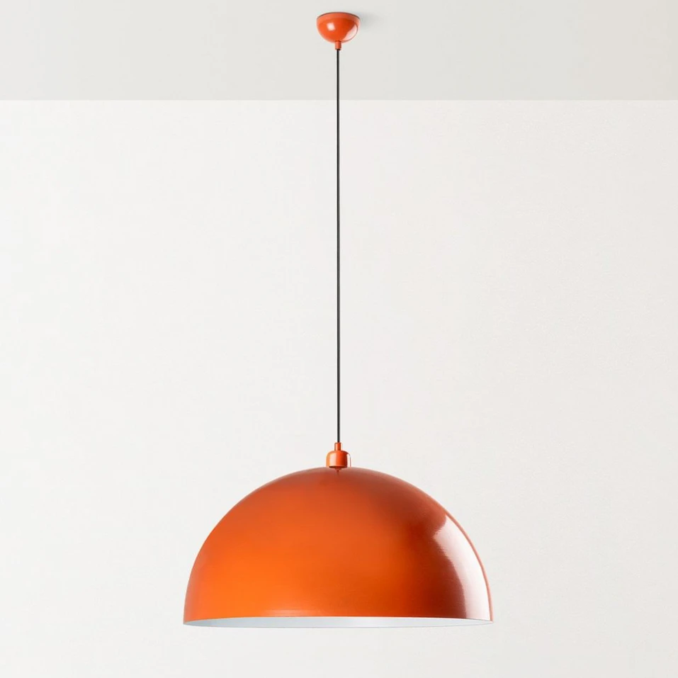 Die Hängeleuchte Kure wurde aus lackiertem Metall gefertigt und mit einem weiten, halbkugelförmigen Schirm ausgestattet. Sie setzt einen Farbakzent im Raum und eignet sich hervorragend zur Beleuchtung eines Tisches oder einer Theke in Küche oder Esszimmer. Die weiße Innenseite des Schirms reflektiert das Licht und gewährleistet damit eine optimale Lichtausbeute. Mit dem Einsatz eines dimmbaren Leuchtmittels lässt sich die Leuchte über einen externen Dimmer inder Rauminstallation dimmen.