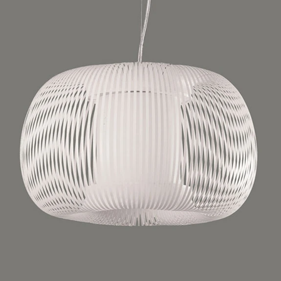 Die Hängeleuchte Mirta formt sich ähnlich einem Pfirsich - ihr abgerundeter Schirm besteht aus vielen feinen Streben, die parallel zueinander aus dem innenliegenden Diffusor hervorgehen und sich nach außen wölben. Dadurch entsteht die leicht bauchige Form. Der Diffusor im Inneren ist säulenförmig und blickdicht, während man durch die Streben einen genauen Blick auf ihn erhält. Nach oben und unten ist eine Öffnung im Schirm eingearbeitet. In den Diffusor wird das E27-Leuchtmittel eingebaut, wodurch ein blendfreies Licht nach Außen tritt. Aufgrund der Streben entsteht zusätzlich ein ansprechendes Muster. Mirta eignet sich sowohl für Esszimmertische als auch für Theken oder zur Beleuchtung im Wohnzimmer.