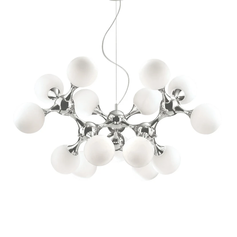 Die Hängeleuchte Nodi Bianco ist ein flexibler und zugleich edler Begleiter für das Zuhause. Durch das Chromfinish auf dem Gestell bzw. den Verbindungselementen strahlt die Leuchte auch im ausgeschalteten Zustand Glanz aus und sieht sofort hochwertig aus. Die Kugeln bestehen aus geblasenem Glas. Durch einen abschließenden Ätzvorgang wird die Oberfläche matt und rau. Im Innern befindet sich je eine E14-Fassung, deren Licht sanft und blendfrei austritt. Das warme Licht verteilt sich durch die unterschiedliche Ausrichtung der Kugeln im ganzen Raum.