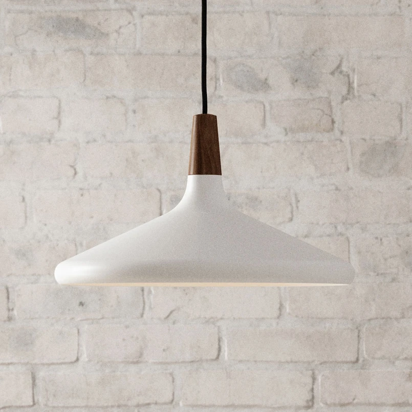 Nori besticht mit seinem nordischen Charme und Minimalismus. Der lichtundurchlässige Schirm ist aus Metall gefertigt und sorgt für eine direkte und punktuelle Beleuchtung, indem ein Leuchtmittel ganz nach Wahl in die Fassung geschraubt wird. An dem kegelförmigen Schirm ist am Übergang zum Kabel ein dunkles, Walnuss-Holz-Detail eingearbeitet, welches den skandinavischen Look inszeniert und zusätzlich FSC-zertifiziert ist. Wunderschön als einzelne Variante, aber auch in einer Reihe mit mehreren, dient Nori zum Beispiel als Tischbeleuchtung oder zur Illumination einer Bar oder dem Empfangsbereich.
