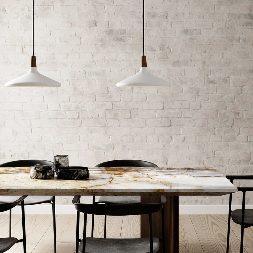 Hängeleuchte Nori mit Metallschirm Nori besticht mit seinem nordischen Charme und Minimalismus. Der lichtundurchlässige Schirm ist aus Metall gefertigt und sorgt für eine direkte und punktuelle Beleuchtung, indem ein Leuchtmittel ganz nach Wahl in die Fassung geschraubt wird. An dem kegelförmigen Schirm ist am Übergang zum Kabel ein dunkles, Walnuss-Holz-Detail eingearbeitet, welches den skandinavischen Look inszeniert und zusätzlich FSC-zertifiziert ist. Wunderschön als einzelne Variante, aber auch in einer Reihe mit mehreren, dient Nori zum Beispiel als Tischbeleuchtung oder zur Illumination einer Bar oder dem Empfangsbereich. - designt von Björn + Balle aus Kopenhagen