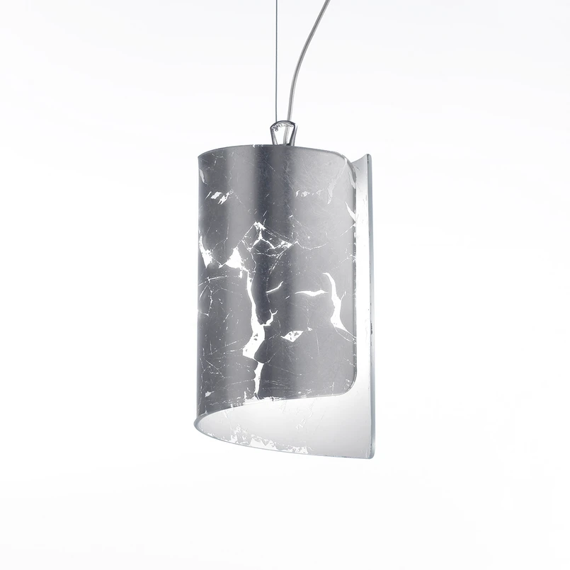 Die Hängeleuchte Papiro besitzt einen formschön gewundenen Glasschirm aus satiniertem, goldenen oder silbernem Glas, welcher leicht in sich zusammengerollt wirkt. Aufgrund der Tatsache, dass das Leuchtmittel in seinem Inneren verborgen ist, entsteht eine besonders harmonische und leicht indirekte Beleuchtung.