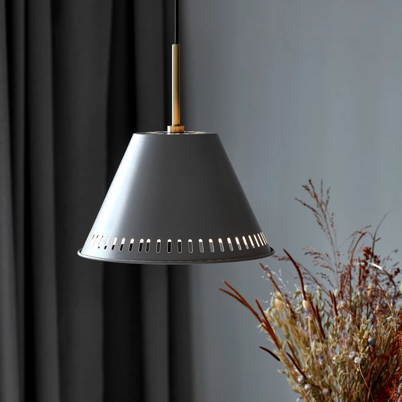 Der matt lackierte, innen weiße Metallschirm der Hängeleuchte Pine ist als Kegelstumpf geformt und mit einem regelmäßigen Durchbruchmuster an der Oberseite sowie am unteren Rand verziert. Das Licht der eingesetzten Lampe wird so nicht nur nach unten emittiert, sondern dringt auch durch die Löcher nach oben und zu den Seiten. Es entsteht ein charakteristischer Lichteffekt, der den Raum stimmungsvoll erfüllt. Das Kabel wird durch ein Messing-Element in den Schirm geführt.