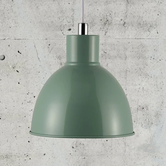Der Schirm der Hängeleuchte Pop ist als nach unten geöffnete Kuppel gestaltet. In Kombination mit der einfarbigen Lackierung ergibt sich eine optisch zurückhaltende Pendelleuchte, die sich in vielen unterschiedlich eingerichteten Innenräumen zur direkten Beleuchtung eignet - insbesondere über dem Wohn- und Esszimmertisch. Nur ein kleines metallisches Element, durch welches das Haltekabel mit dem Schirm verbunden ist, sorgt für einen optischen Kontrapunkt.