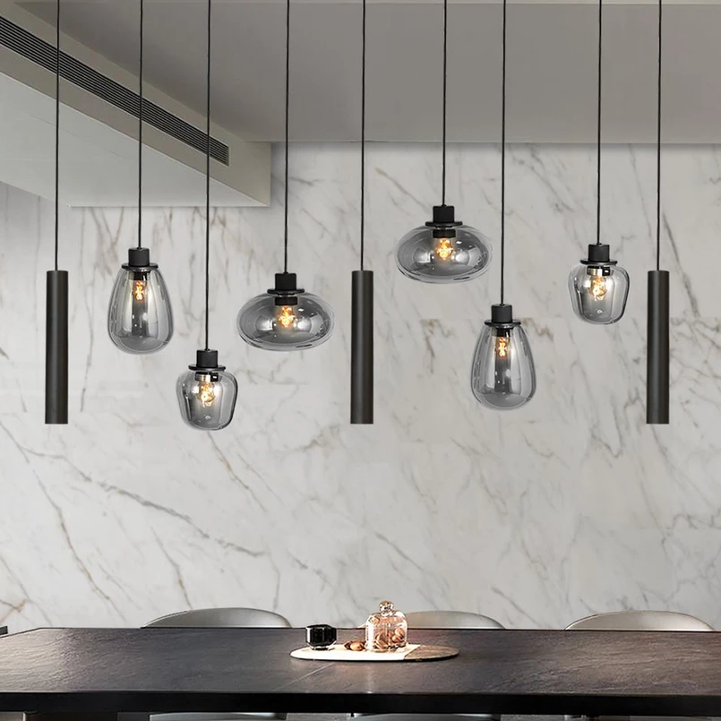 Mit der schwarzen Hängeleuchte Reflexion wird jedes Interieur aufgewertet. Die imposante, neunflammige Leuchte ist ein Eyecatcher über einem langen Esstisch und begeistert durch eine besondere Lichtwirkung. Während in den drei langen, zylindrischen Metallschirmen GU10-Fassungen sitzen und hierfür LED-Leuchtmittel mitgeliefert werden, lassen sich die sechs unterschiedlich geformten Schirme aus getöntem Glas mit E27-Leuchtmitteln bestücken, die nicht mitgeliefert werden. Besonders dekorativ wirken hier LED-Leuchtmittel mit klarem Glas und LED-Filamenten. Die LED-Reflektoren in den Röhren sorgen für direktes Licht auf dem Tisch, während die Leuchtmittel in den Glaskugeln den gesamten Raum beleuchten.