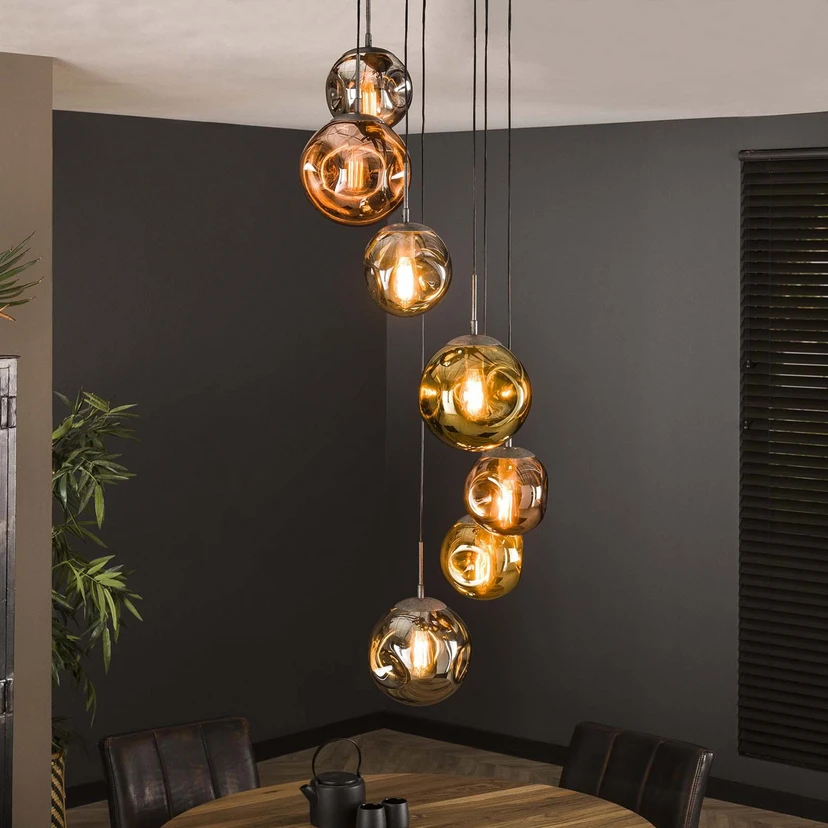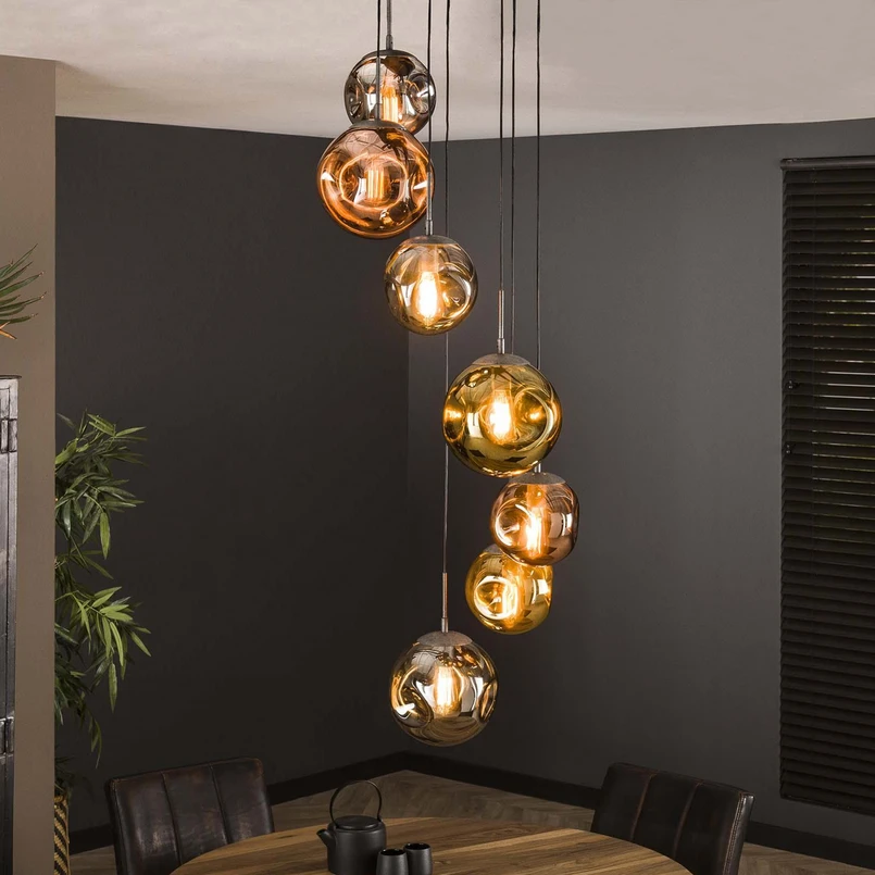 Die siebenflammige Hängeleuchte Stellar mit Glasschirmen in interessanter Form und gold- kupfer- und chromfarbenem Finish vereint kunstvoll Glas und Metall zu einem faszinierenden Lichtobjekt. Die mehrfarbigen Glaselemente schaffen ein harmonisches Farbspiel, das jedem Raum eine besondere Atmosphäre verleiht. Die lange Abhängung macht die Leuchte zum perfekten Lichtobjekt für Treppenhäuser, Galerien oder auch hohe Räume. Dank der Möglichkeit zur Dimmbarkeit per externem Dimmer lässt sich die Lichtintensität individuell anpassen, um die gewünschte Stimmung zu erzeugen. Voraussetzung ist der Einsatz dimmbarer Leuchtmittel.