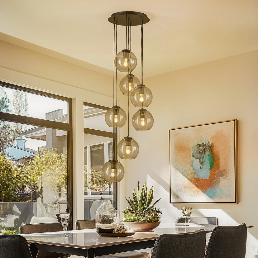 Die Hängeleuchte Vetro aus Glas vereint zeitlose Eleganz mit moderner Vielseitigkeit. Gefertigt aus hochwertigem Glas und lackiertem Stahl, bietet diese siebenflammige Leuchte eine beeindruckende Lichtinszenierung, die jeden Raum in ein stilvolles Ambiente taucht. Die Kombination aus schwarzem und rauchgrauem Design sorgt für eine harmonische Integration in verschiedenste Einrichtungsstile, sei es im Wohnzimmer, in der Küche oder im Esszimmer.