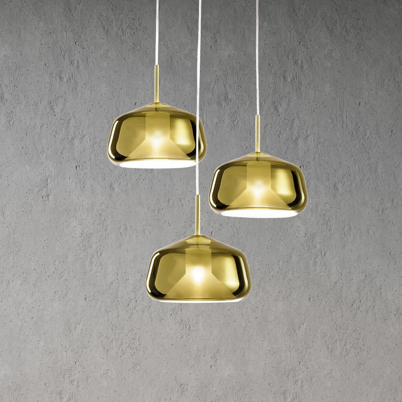 Als eleganter Lichtspender mit dekorativem Wert bereichert die Hängeleuchte X-Ray Wohn- und Aufenthaltsräume. Die vom italienischen Architekten und Designer Davide Negri entworfene Leuchtenserie zeichnet sich durch die Kombination von Glas und Metall aus. Bei dieser Pendelleuchte bestehen die drei in weiter, runder Form gestalteten Lampenschirme aus golden getöntem Pyrexglas und hängen im Rondell unterhalb eines runden Baldachins im gebürsteten Goldfinish.