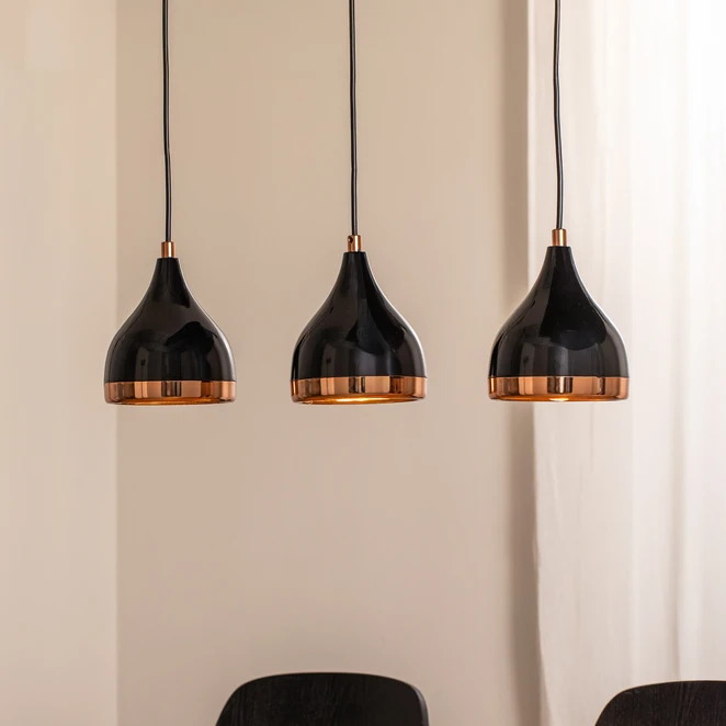 Die Pendelleuchte Yildo, ein dreiflammiger Blickfang in Schwarz und Kupfer, verkörpert moderne Eleganz und bietet eine ideale Beleuchtungslösung für Wohnzimmer und Essbereich.