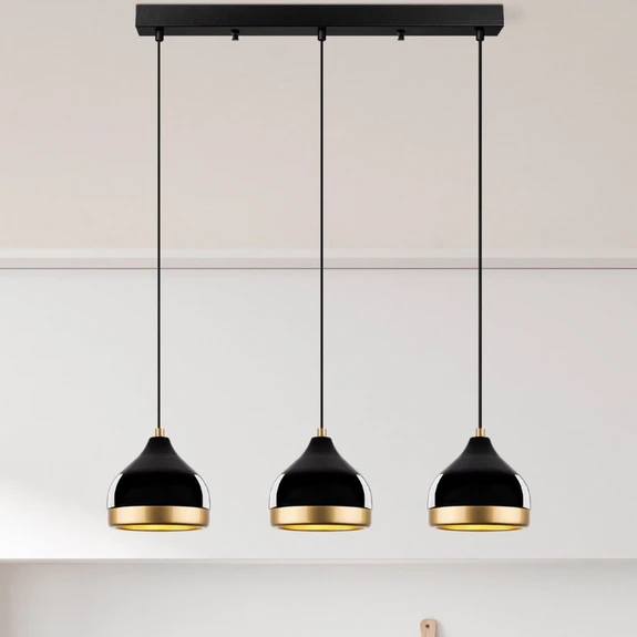 Die Hängeleuchte Yildo besticht durch ihr modernes Design und die harmonische Verbindung von schwarzem und goldenem Metall. Diese Leuchte fügt sich nahtlos in verschiedene Wohnbereiche wie Wohnzimmer, Esszimmer und Küche ein und setzt dort stilvolle Akzente. Die hochwertige Verarbeitung und das zeitlose Design machen sie zu einem Blickfang in jedem Raum.