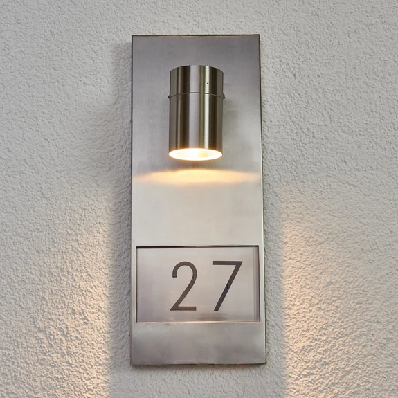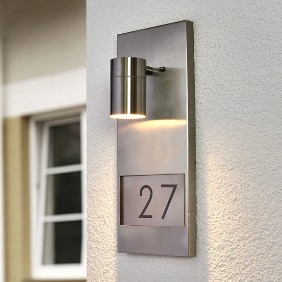 Hausnummernanzeige und Außenwandleuchte in einem bietet die Modena 7655: Das schlichte Design unterstreicht das modische Erscheinungsbild. Ein kleiner Strahler beleuchtet die darunter liegenden Ziffern. Die Lieferung erfolgt inklusive Ziffern (3 x 0-9).