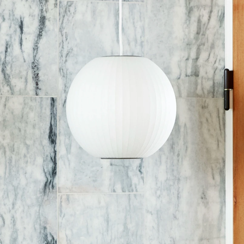 Die Hängeleuchte Nelson Ball Bubble ist eine volle, perfekt runde Kugelleuchte, die jedes Interieur mit einem warmen, diffusen Licht erfüllt. Inspiriert von seidenbezogenen, schwedischen Hängeleuchten, die er für sein Büro wollte, ihm aber zu teuer waren, schuf der amerikanische Designer George Nelson bereits im Jahr 1947 diese Leuchte, die erstmals 1952 hergestellt wurde. Mit dem großem Einfallsreichtum, der seinen Arbeitsprozess auszeichnete, entschied er sich für ein selbstvernetzendes Kunststoffspray, das vom US-Militär entwickelt wurde, und brachte es auf einem leichten, abgerundeten Stahlrahmen an, um diese weich leuchtenden Schirme herzustellen. Damals signalisierte die Bubble-Lamp eine Revolution in der modernistischen Beleuchtungsindustrie und bis heute hat die Leuchtenkreation nichts von ihrem Reiz eingebüßt.
