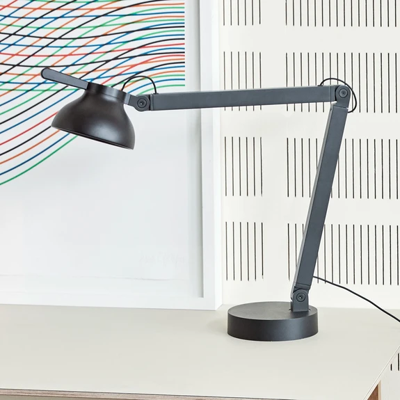 Pierre Charpin entwarf die Arbeitsleuchte PC Double Arm für das dänische Unternehmen HAY. Präzise konstruiert und funktional im Design bietet die Schreibtischleuchte fokussiertes Licht und bleibt dank im Gestell integrierter Gasfedern immer perfekt in Position.