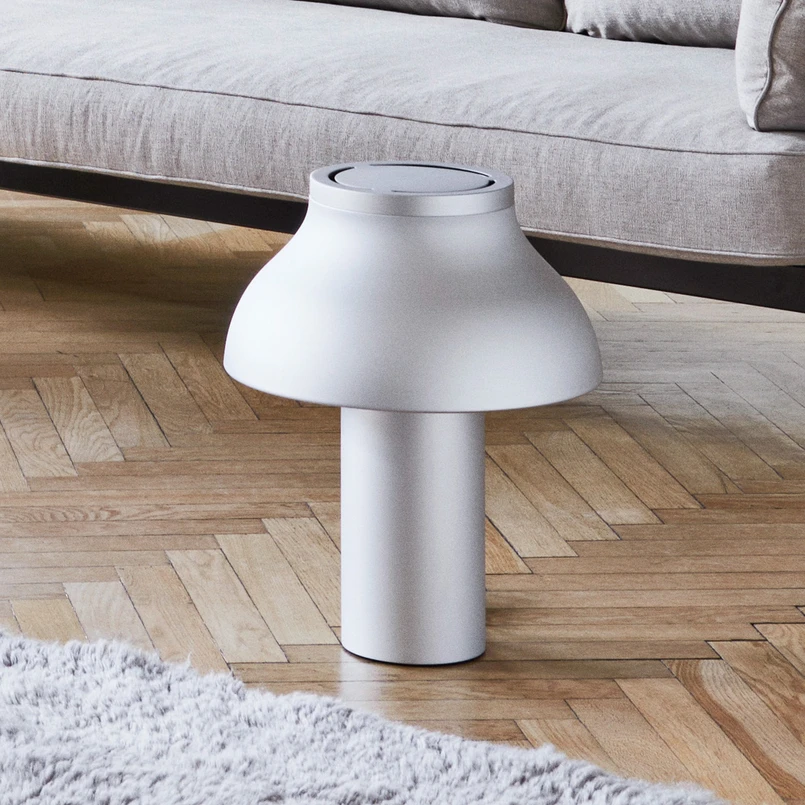 PC ist eine Tischleuchte des französischen Designers Pierre Charpin, die aus eloxiertem Aluminium gefertigt wurde. Ein zylindrischer Fuß trägt einen Schirm in geschwungener Form, in dem das Leuchtmittel sitzt. Dieses strahlt durch einen transluzenten, spritzgegossenen Diffusor aus Polycarbonat das Licht nach unten, was zum einen eine blendfreie und sanfte Beleuchtung gewährleistet und zum anderen die Form der Tischleuchte eindrucksvoll inszeniert. Ein im Fuß integriertes Gewicht garantiert beste Standfestigkeit. Die Tischleuchte ist mit einem geflochtenen Textilkabel mit Eurostecker ausgestattet und zur Regulierung der Helligkeit wurde unten im Fuß ein Stufendimmer integriert.