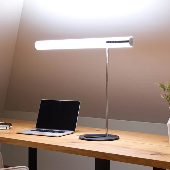 Fürs Homeoffice konzipiert: Die multifunktionale LED-Schreibtischleuchte HEAVN One, mit QI-Ladestation & Raumluftsensor