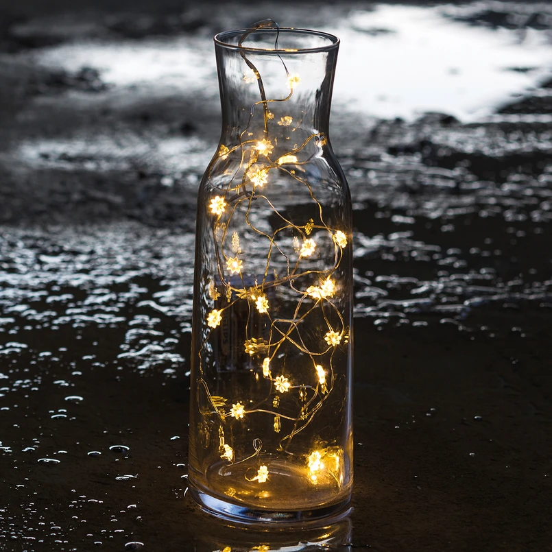 An dieser Lichterkette hat man das ganze Jahr Freude. Sie wirkt mit den kleinen, von LED beleuchteten Blumen einfach zauberhaft als Dekoration auf einer Kaffeetafel, auf einer Fensterbank oder auch in einer Glasvase. Die Lichterkette Silke kommt ohne Netzanschluss aus. Das Kabel der Lichterkette ist transparent und fällt optisch kaum auf. Die Lichterkette Silke wird mit 2 x AA-Batterien betrieben, die nicht zum Lieferumfang gehören (über Zubehör bestellbar).