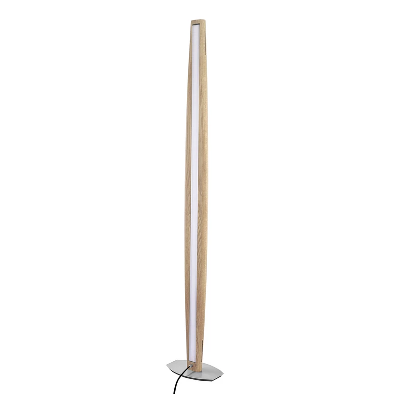 Eine moderne Formgebung und natürliche Ausstrahlung gehen bei der LED-Stehleuchte Arco Hand in Hand. Oberhalb eines flachen Fußes aus matt gebürstetem Nickel erhebt sich der schlanke, leicht oval geformte Korpus aus Holz. Dieser ist zu einer Seite mit einem durchgängigen LED-Streifen versehen, sodass je nach Orientierung der Stehlampe direkte Beleuchtung oder indirekte Beleuchtung über die Wand erzielt wird. Zur Bedienung stehen ein Fußschalter auf dem Kabel (an/aus) sowie ein Touch-Sensor oben am Holzelement (an/aus, dim-to-warm) bereit.