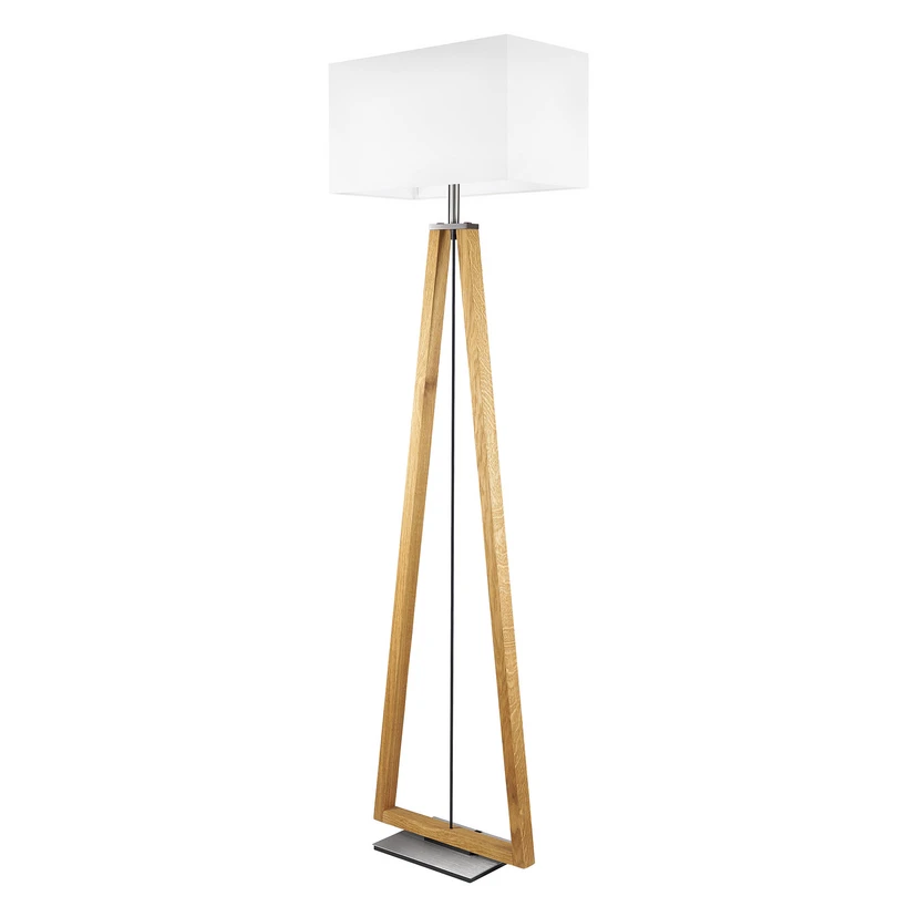 Stehleuchte Bi Bob mit zweibeinigem Holzgestell, Stoffschirm und Metallfuß