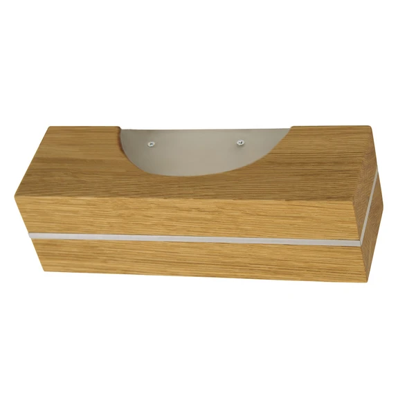 Bei der LED-Wandleuchte Dana steht eindeutig der Werkstoff Holz im Vordergrund. Der Korpus in liegender Quaderform ist aus Massivholz gearbeitet und lediglich von einer kleinen, horizontal verlaufenden Metallleiste unterbrochen. Das Metall dient als modernes Stilmittel, während das geölte Holz mit seiner deutlichen Maserung für den natürlichen Touch und Gemütlichkeit sorgt.