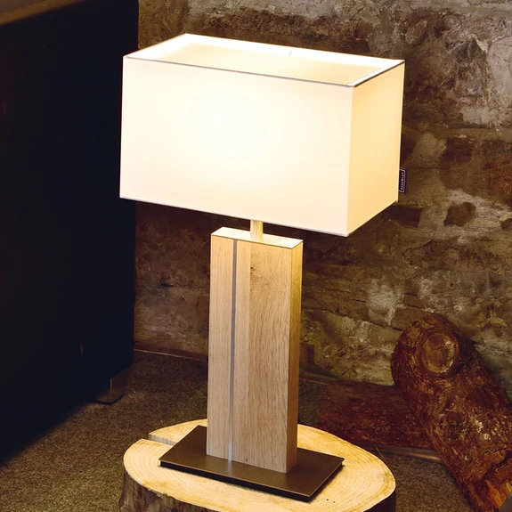 Tischleuchte Miss Hilton aus Holz, Textil und Metall