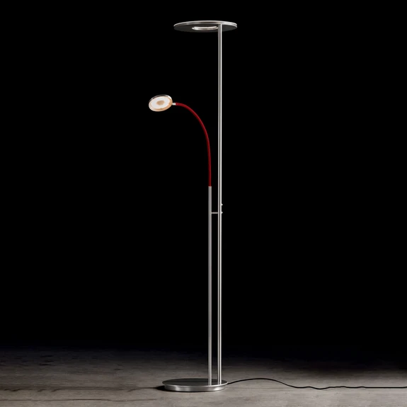 Zusatzbeleuchtung nach Maß für den modernen Wohnraum bietet der LED-Deckenfluter Nova Flex von Holtkötter. Während der eine Teil des Metallgestells gerade in die Höhe führt und die Fluterbeleuchtung beinhaltet, geht die zweite Gestellstange im oberen Teil in einen flexiblen Schlauch aus strapazierfähigem Material über. Am Ende des Schlauchs ist eine runde Leseleuchte angebracht, deren Lichtabstrahlung durch die Biegsamkeit des Arms ganz nach Belieben dorthin gelenkt werden kann, wo das Licht benötigt wird. Es sind zwei Tastdimmer verbaut, sodass sowohl die Beleuchtung des Fluters als auch die der Leseleuchte stufenlos in der Helligkeit reguliert werden kann.