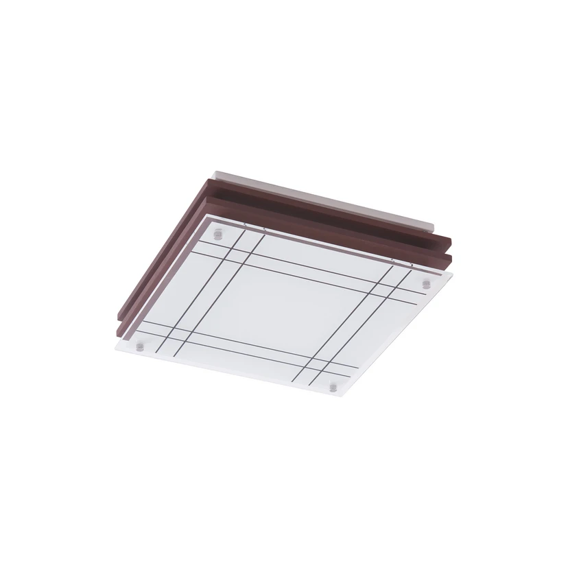 Quadratische Deckenlampe Thees mit dunkelbraunen MDF-Elementen und karierter Glasplatte