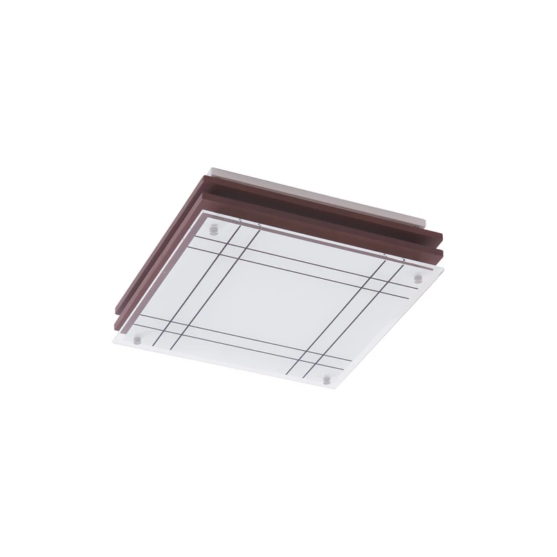 Die Deckenleuchte Thees besteht aus zwei dunkelbraunen MDF-Rahmen, die für eine weiche Lichtverteilung um eine weiße Glasplatte mit ansprechendem Karomuster ergänzt worden sind. Der von der Deckenlampe erzeugte Lichtschein ist einladend und gemütlich und die Leuchte kann nicht nur in Flur oder Schlafzimmer montiert werden, sondern macht auch im Wohnbereich eine gute Figur.