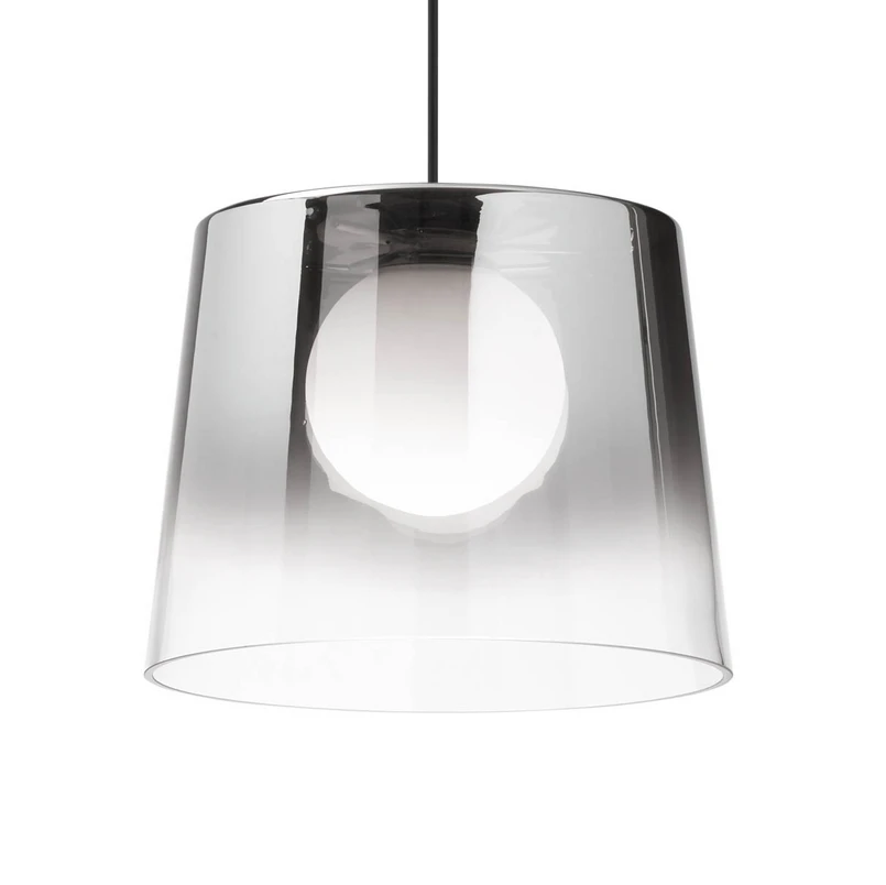 Der doppellagig gestaltete Leuchtenschirm macht die Hängeleuchte Fade zu einer interessanten und angenehm blendfrei strahlenden Leuchte für den Esstisch und viele weitere Bereiche. Einzeln oder als Paar montiert, erhellt sie auch lange Tische und wirkt ungemein dekorativ. Während der kugelförmige Innenschirm aus säuregeätztem Glas besteht, durch den das Licht entblendet und gleichmäßig rumdum verteilt wird, besteht der Außenschirm in zylindrischer Form aus geblasenem, transparentem Glas, das mit einer Tönung versehen wurde, die nach unten in sanftem Verlauf immer heller wird.