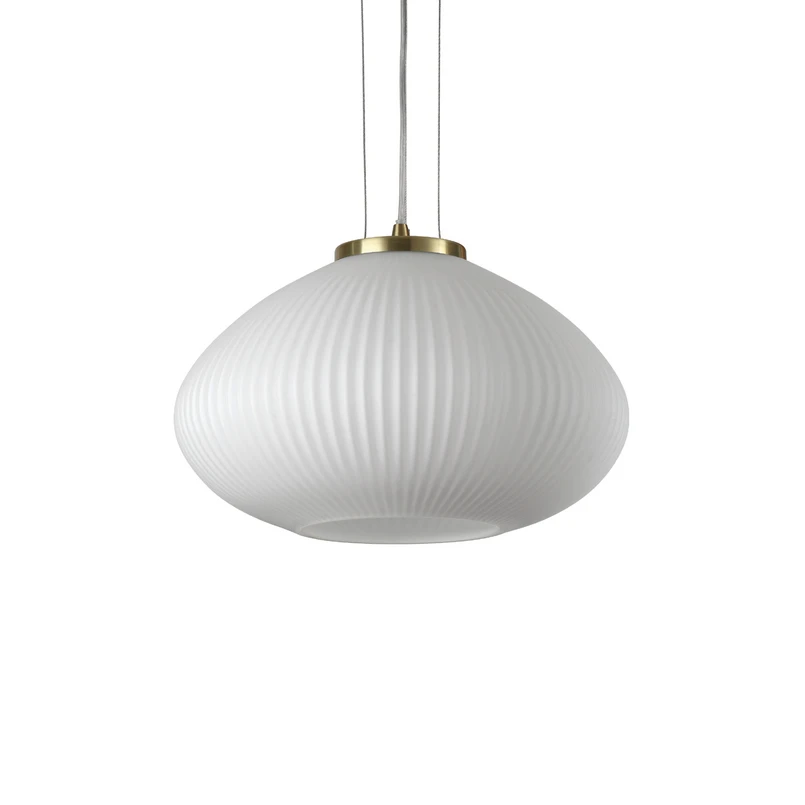 Der Name Plisse sagt schon einiges über die Optik der Pendelleuchte Plisse aus, denn der Schirm wirkt wie aus plissiertem, d. h. in Falten gelegtem Stoff, gearbeitet. Das täuscht. Der Schirm wurde aus geblasenem, weißem, säuregeätztem Glas hergestellt, in das ein dekoratives Reliefmuster eingebracht wurde. Der plattierte Metallrahmen ist messingfarben lackiert.