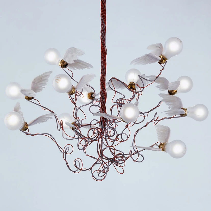 Zwölf beflügelte LED-Lampen sind an wirren, miteinander verworrenen und verknoteten Drähten und Kabeln befestigt, die sich inmitten der Leuchte bündeln und an der robusten Aufhängung empor winden. Die Hängeleuchte Birdie des Münchener Leuchtendesigners Ingo Maurer steht sinnbildlich für einen Schwarm Vögel, denn auch die echten Piepmätze streben in alle Himmelsrichtungen davon, wenn sie einmal aufgescheucht werden. Die Flügel der als Vögelchen gestalteten Leuchtmittel sind aus handgearbeiteten Gänsefedern gefertigt und verleihen Birdie die nötige Leichtigkeit. So muss Birdie nicht unbedingt leuchten, um ihre Wirkung als Designerstück zu erzielen. Wird sie eingeschaltet, sorgen die mattierten Lampen für gleichmäßiges, angenehmes Licht.