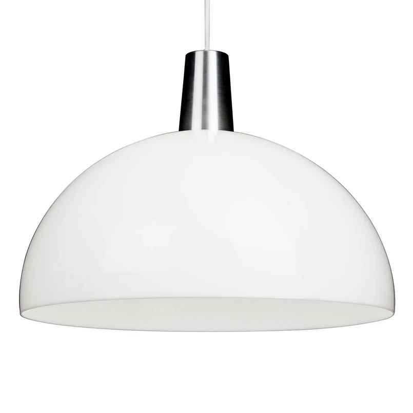 Der kuppelartige Schirm der Hängeleuchte Kupoli (finnisch für Kuppel) besteht aus weißem Acryl und erlaubt so ein sanftes Durchscheinen des Lichts auch nach oben und zu den Seiten. Am Übergang vom Schirm zur Abhängung befindet sich ein schlichtes und doch edles Detail aus Aluminium.