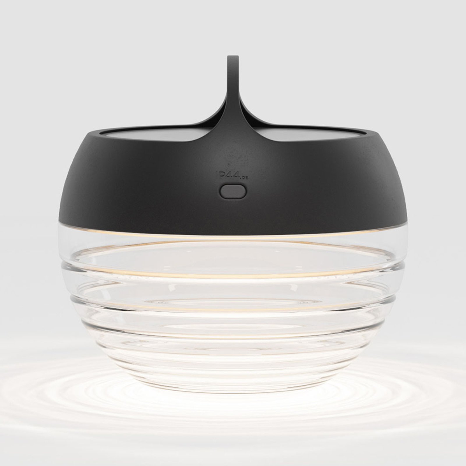 Die aus mundgeblasenem Kristallglas gefertigte LED-Solarleuchte Aqu S ist kugelförmig und schließt nach oben mit einem Aluminiumelement ab, in das das Solarpanel und ein formschöner Tragegriff integriert ist. Außerdem ist seitlich der Schalter, über den sich die Leuchte bedienen und in drei Stufen dimmen lässt, integriert.